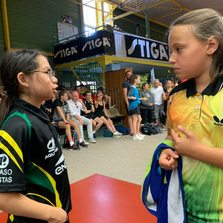 En binôme avec sa copine Lola du club de Villenave avec qui elle partage beaucoup de compétitions nationales benjamines, les filles commencent la compétitions contre deux "gros morceaux", l'une étant classé 7 (11 au mensuel) et l'autre étant elle aussi très bien classé, contre nos girondine classées respectivement 5/6. Défaite logique mais une très belle performance pour Manon qui découvre la particularité de jouer en double avec une coéquipière gauchère.